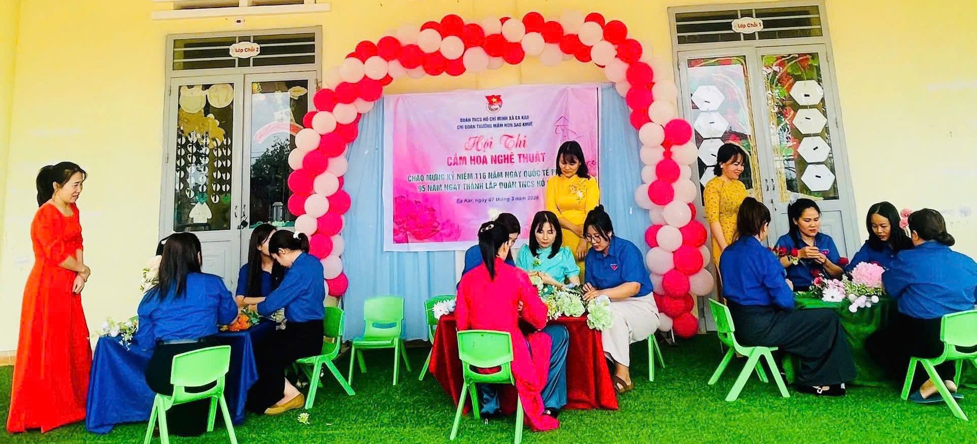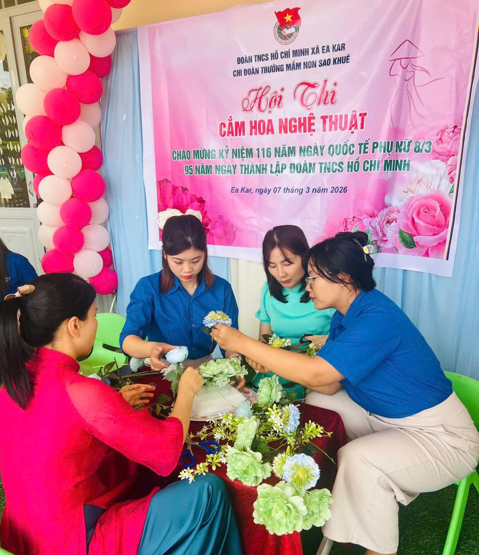 Bên cạnh đó, hội thi cắm hoa diễn ra trong không khí vui tươi, sôi nổi với nhiều tác phẩm đẹp, thể hiện sự khéo léo, sáng tạo của các đội thi.