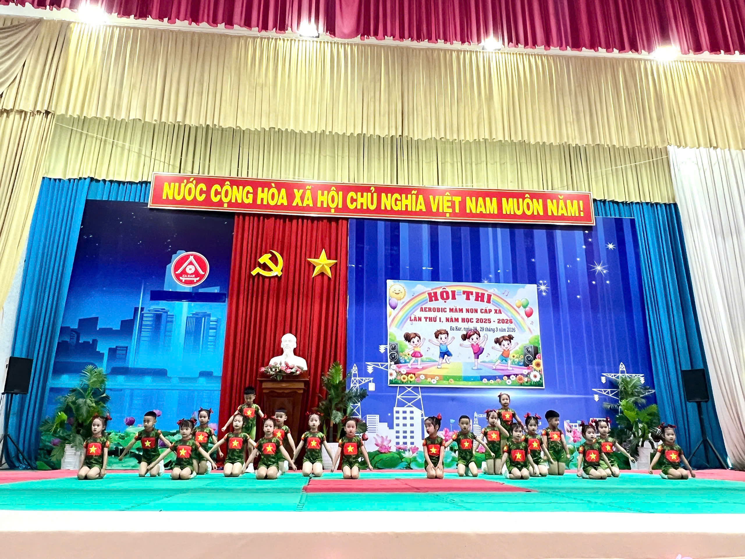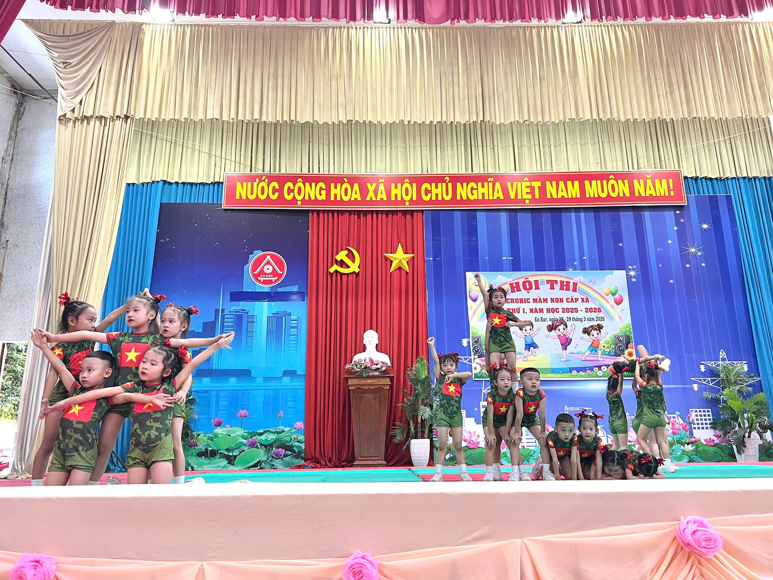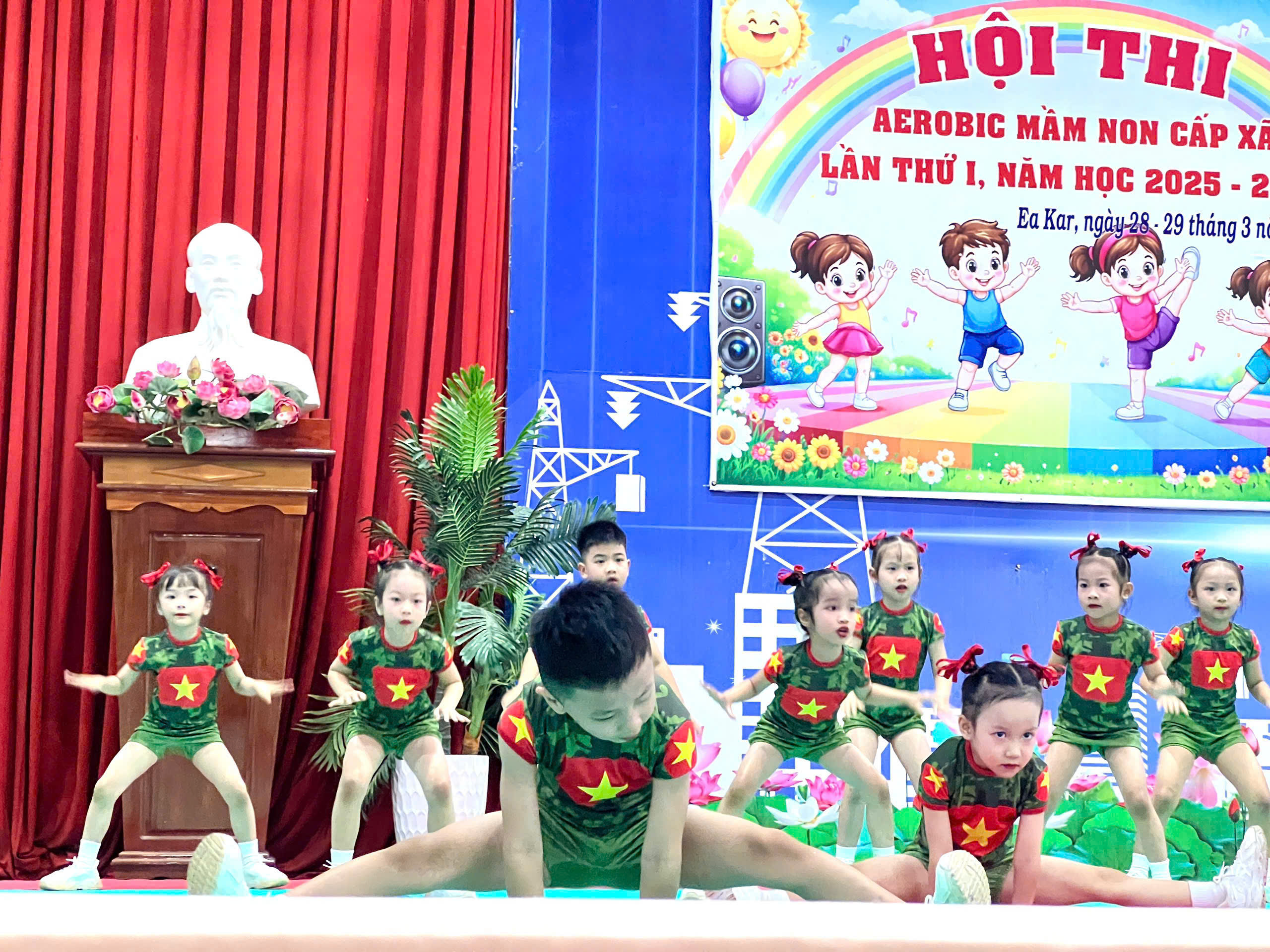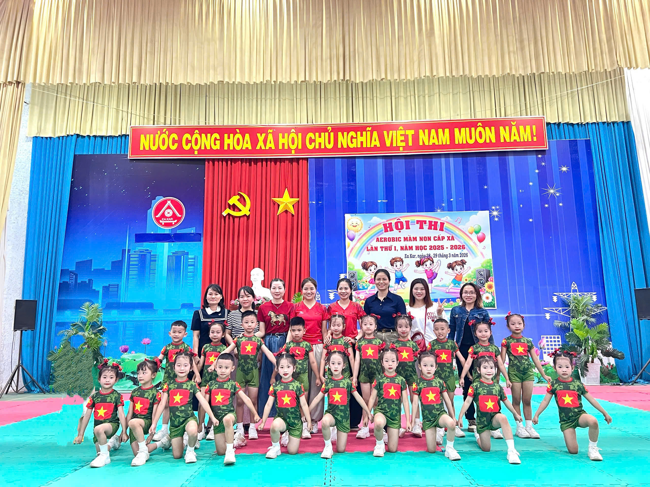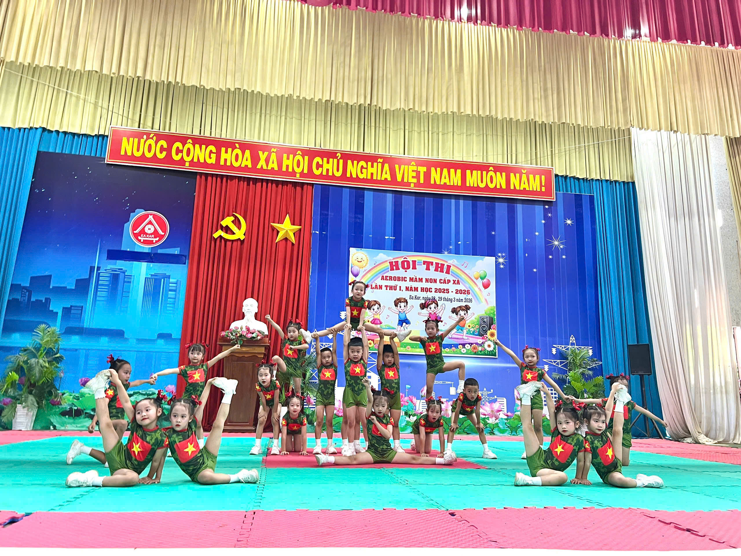 Sáng ngày 28/3/2026 Trường Mầm non Sao Khuê đã tham gia Hội thi Aerobic mầm non cấp xã năm học 2025 – 2026 với tinh thần tự tin, sôi nổi và đoàn kết. Với sự chuẩn bị nghiêm túc cùng quá trình luyện tập tích cực, đội Aerobic của nhà trường đã mang đến phần biểu diễn khỏe khoắn, đồng đều và đầy năng lượng.